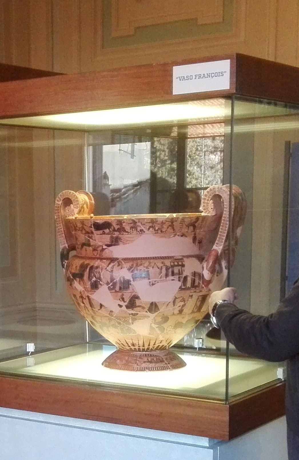 Il vaso François, rinvenuto nella necropoli etrusca di “Fonte Rotella” a Chiusi nel 1844 e 1845, ad opera di Alessandro François, lo scopritore della celebre Tomba François di Vulci, fa oggi parte della collezione del Museo Archeologico Nazionale di Firenze, e questa è la prima volta che lascia Firenze e l’Italia. Si tratta del più antico cratere a volute attico conosciuto. Le sue dimensioni si sviluppano su un’altezza di 66 cm e un diametro massimo di 57 cm, un vero e proprio capolavoro della ceramografia greca, realizzato ad Atene intorno al 565 a.C. Modellato dal vasaio Ergòtimos e dipinto dal pittore Kleitìas, il vaso presenta un complesso e articolato programma figurativo costituito da 270 figure e arricchito da 131 iscrizioni esplicative, il tutto distribuito su nove registri e sei pannelli figurati.
